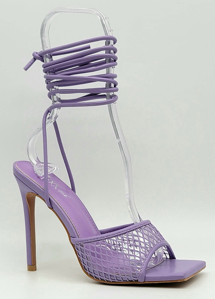 Product Description These adorable net heels are sure to make any outfit pop. Featuring a net fabric, lace up and a cushioned foot bed. Approximately a 4 inch heel.