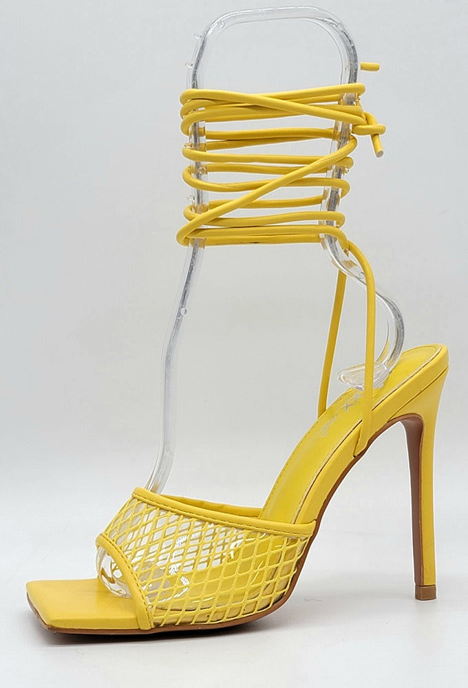 Product Description These adorable net heels are sure to make any outfit pop. Featuring a net fabric, lace up and a cushioned foot bed. Approximately a 4 inch heel.