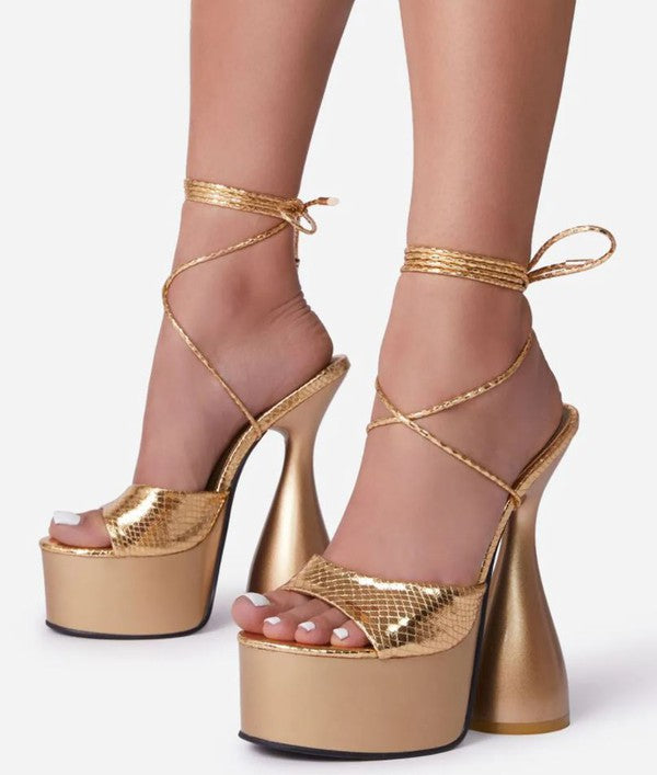 These gorgeous statement heels are a must have for every fashionista. Featuring a lace up detail and stacked heel for that sassy and classy look. Finished with a lightly padded insole and easy slide style. Material: PVC (man-made) Sole: Synthetic Measurement Heel Height: 5" (approx) Platform 3.5”