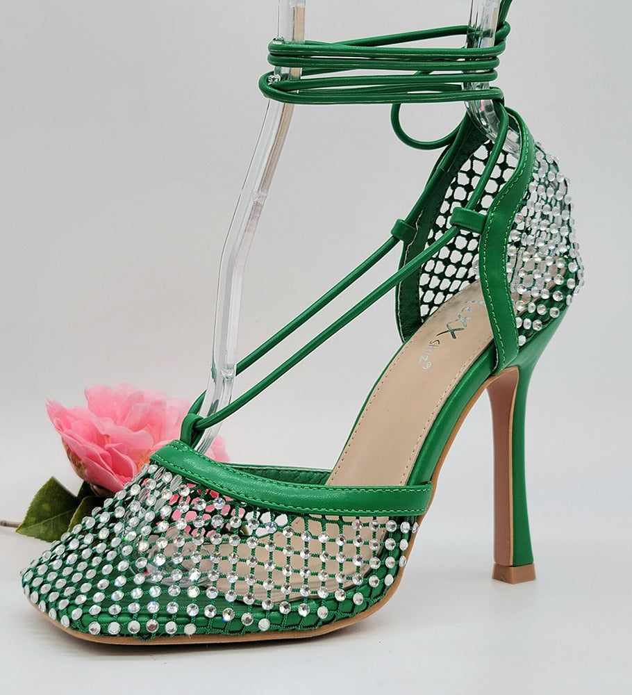 Product Description These adorable net heels are sure to make any outfit pop. Featuring a net fabric, with rhinestone detail, lace up and a cushioned foot bed. Approximately a 4 inch heel.
