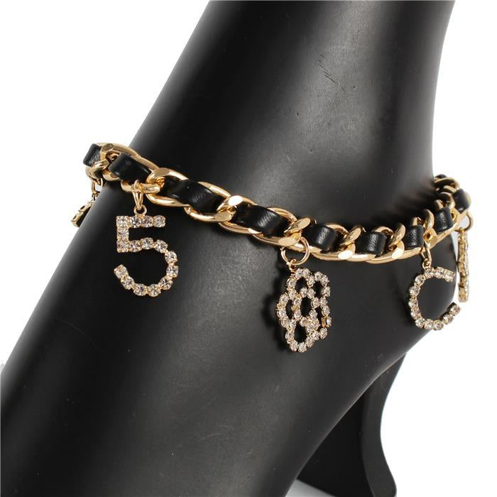Product Description Accessorize any outfit with this anklet. Color : Clear, Gold Metal Faux Leather Chain Charms #5 Flower Urban 10.5" Length 1" Drop Lobster Claw Adjustable up to 12" Anklet Gold