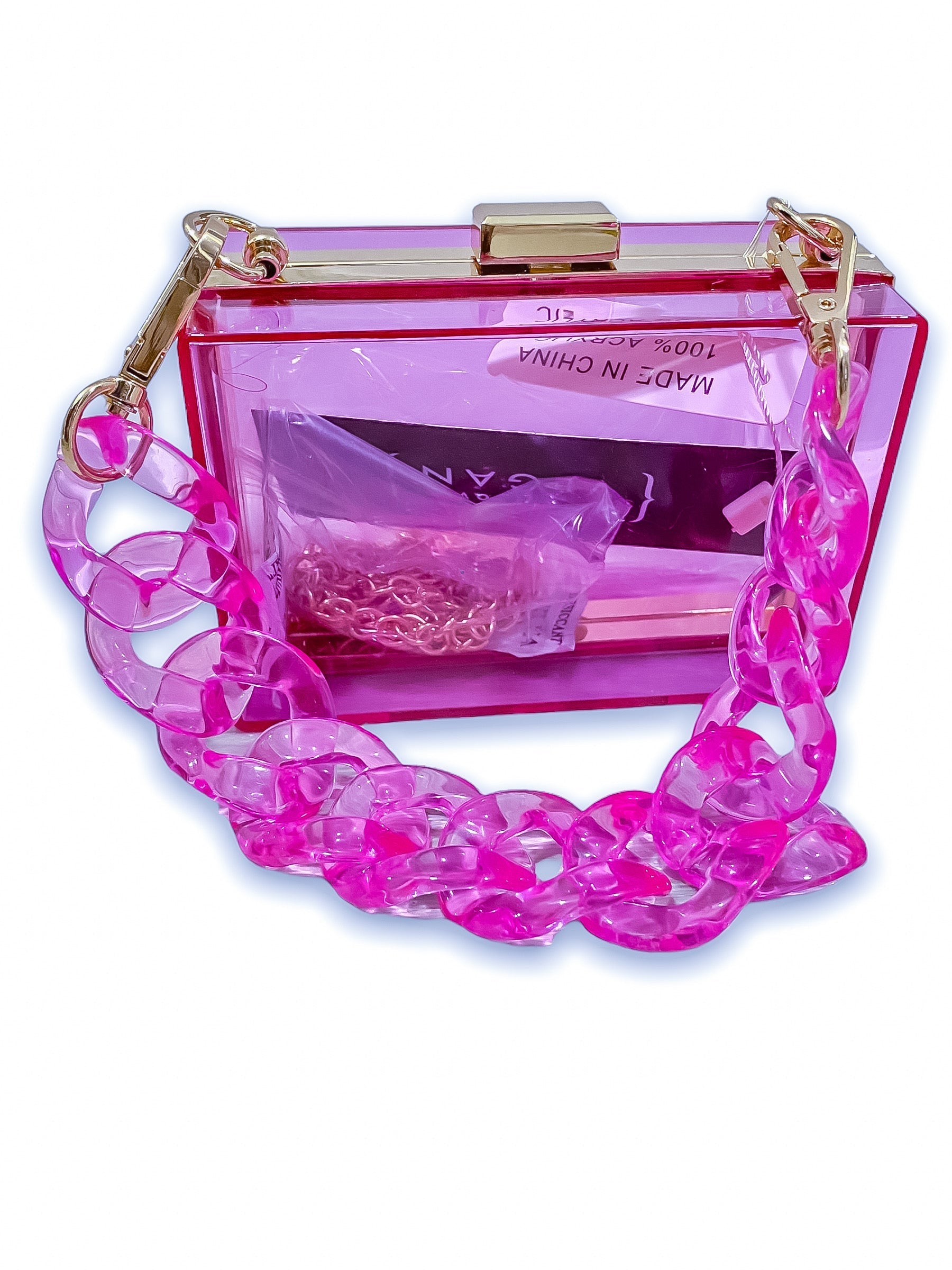 Add to Cart Cinderella Clear Purse Fuchsia MSRP: Was: Now: $39.99 Transparent Clutch W/Link Chain Clear Mini Plastic Case Bag * Acrylic,Mixed Metal.