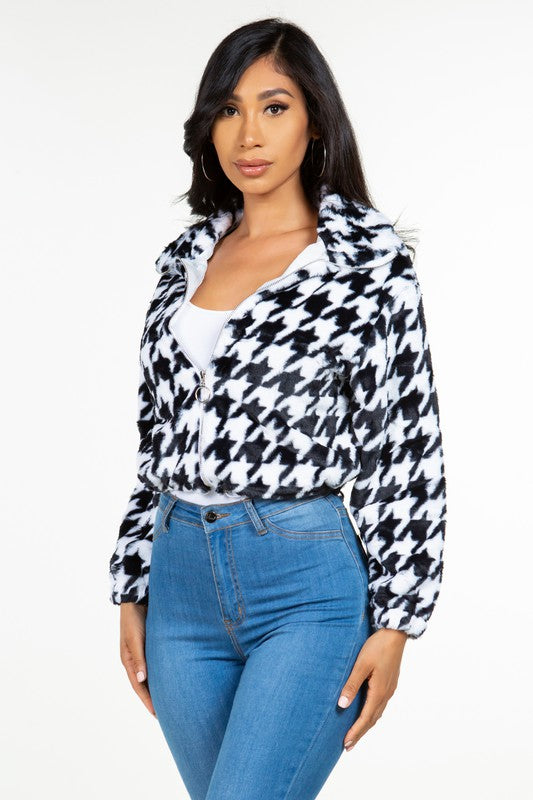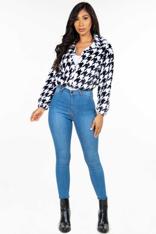 Product Description Black Houndstooth print zip up jacket Fabric Contents 100% POLYESTER PREORDER ONLY! Ships on or around Oct 30th 2024. Preorders cannot be cancelled or modified. If you order other items with your preorder, they will all ship together