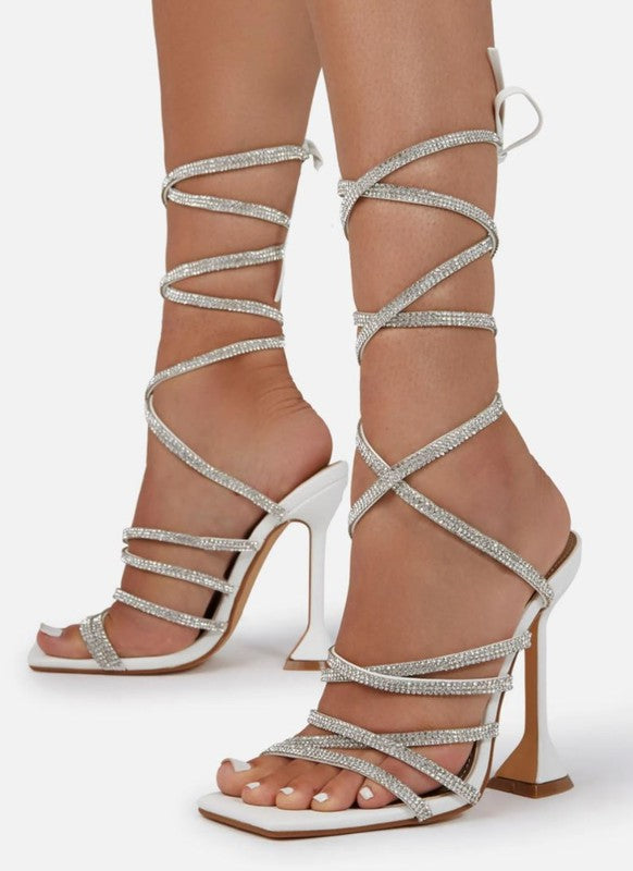 These gorgeous statement heels are a must have for every fashionista. Featuring a lace up rhinestone detail and stacked heel for that sassy and classy look. Finished with a lightly padded insole and easy slide style. Material: PVC (man-made) Sole: Synthetic Measurement Heel Height: 4’’ (approx)