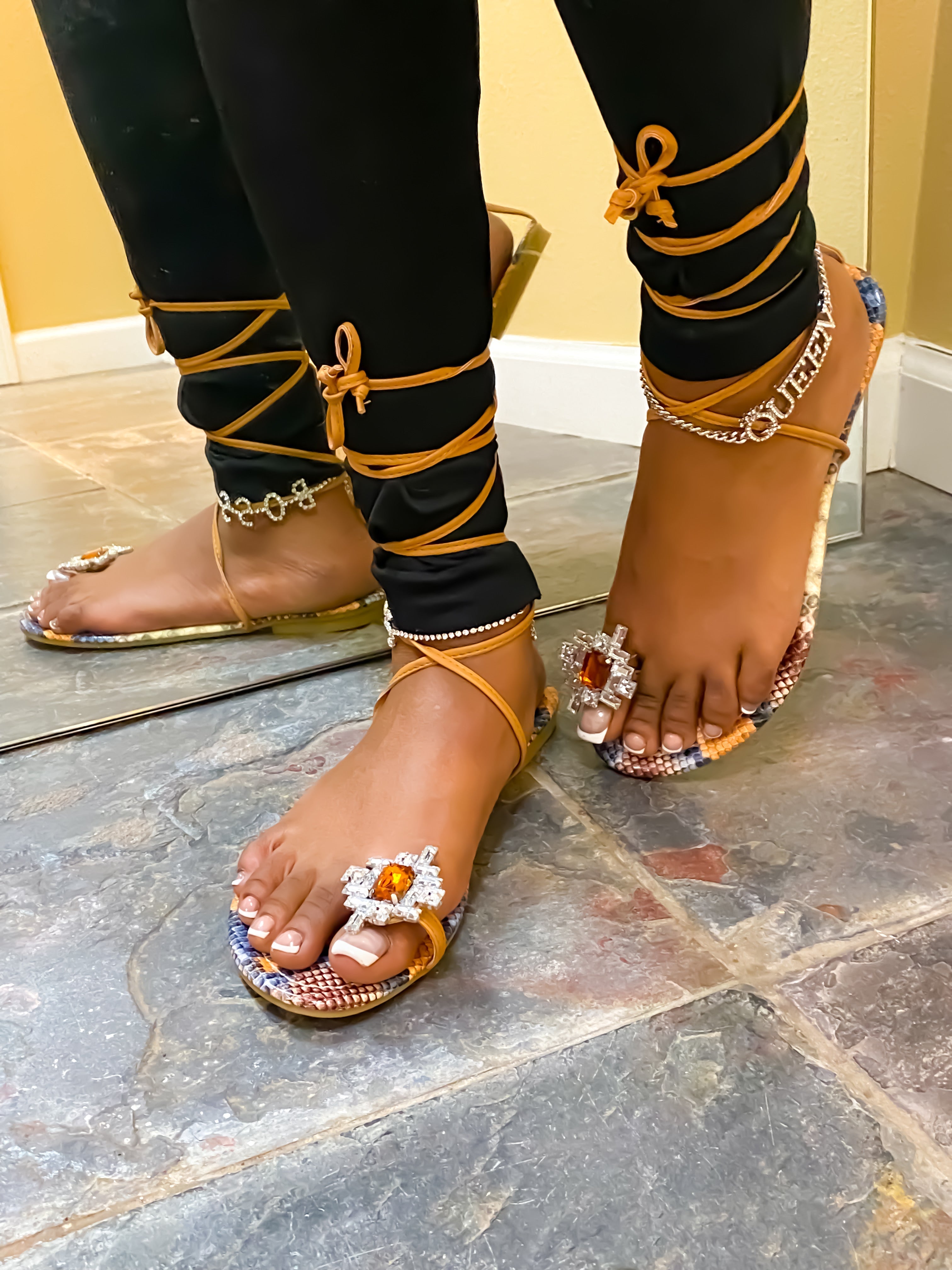 Product Description These adorable statement sandals are sure to make any outfit pop. Featuring a rhinestone toe ring detail, snake prank and tie up laces for that chic look that will make heads turn.