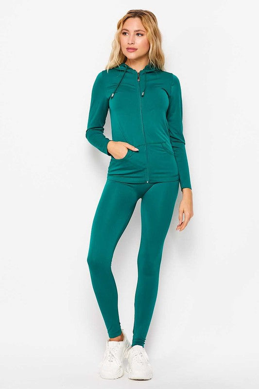 Product Description Two piece stretch set • Long sleeve Top • Front zipper closure • Hoodie • Pockets • High waist legging • 92% Polyester • 8% Spandex • Inseam 25 inch • Hand wash cold water • One size fits most sizes xs-large