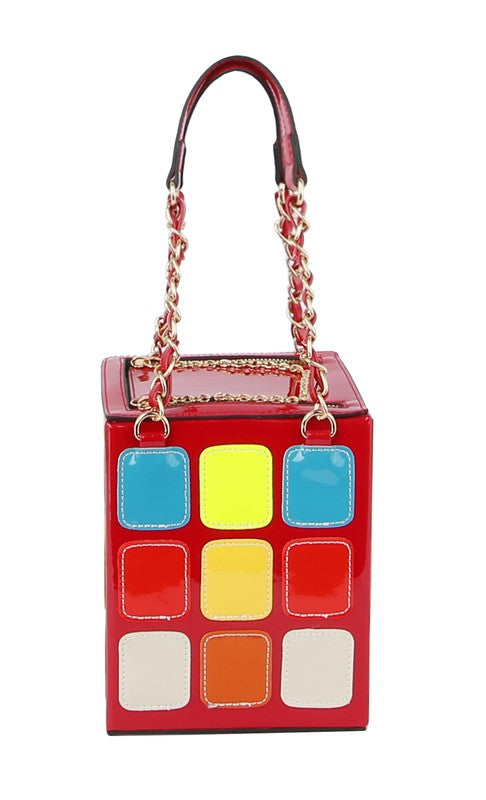 Product Description This super fly purse is a must have for every diva. MULTI COLOR RUBIK CUBE NOVELTY PATENT LEATHER GOLD TONE HARDWARE 5.5 X 5.5 X 7