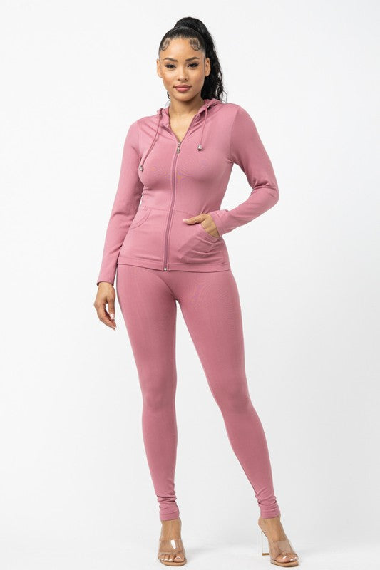 Add to Cart Ola Seamless 2 Piece Set Burgundy MSRP: Was: Now: $44.99 Two piece stretch set • Long sleeve Top • Front zipper closure • Hoodie • Pockets • High waist leggi…